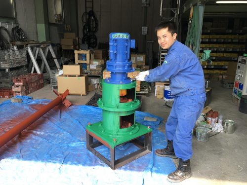 去年の6月に来日し、工場研修10ヶ月を経て本社勤務となりました。 彼が組みつけているのは、生コン工場から出る廃水が凝固しないように掻き混ぜるためのミキサーです。 大分、日本の暮らしや仕事にも慣れ、仲間ともとけこんでいるようです。